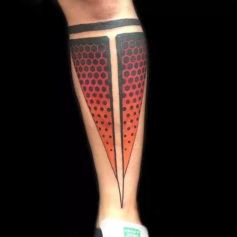 Schienbeintattoo mit Blackwork und farbigen Pattern.