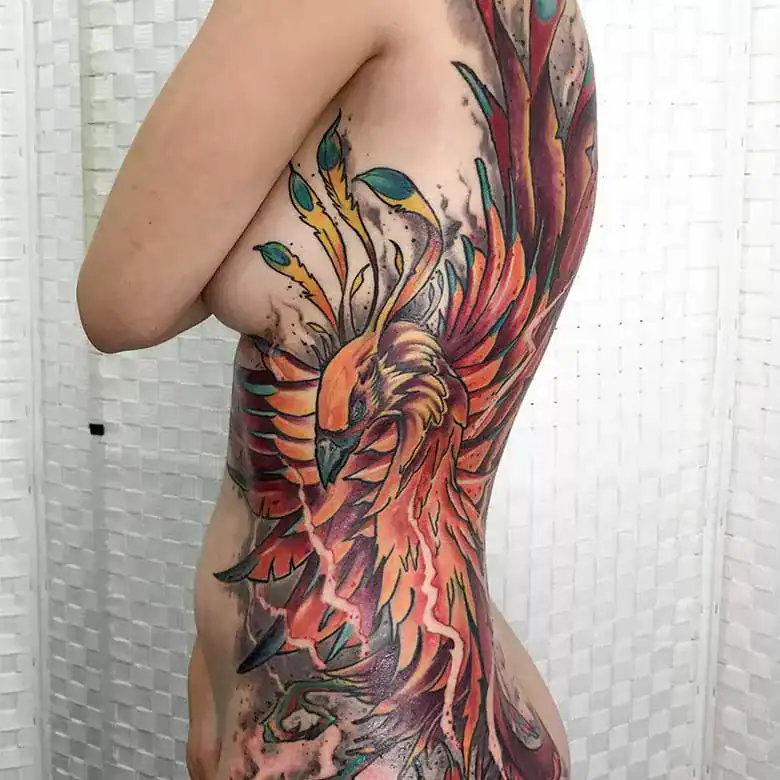 Großes farbiges sketchy Asia Phönix Tattoo auf der gesamten Körperhälfte.